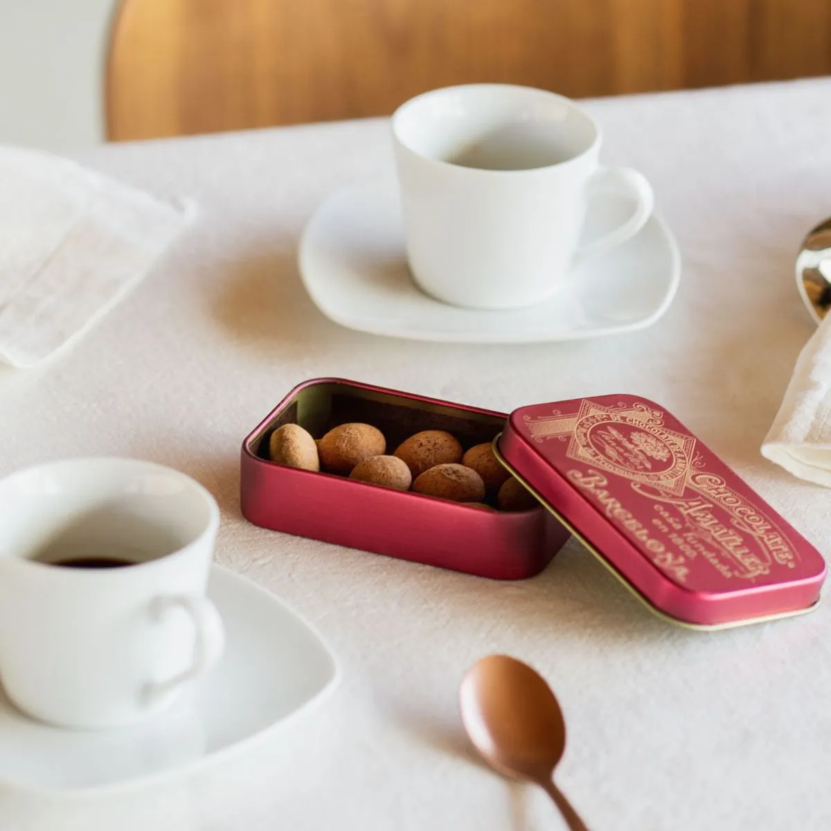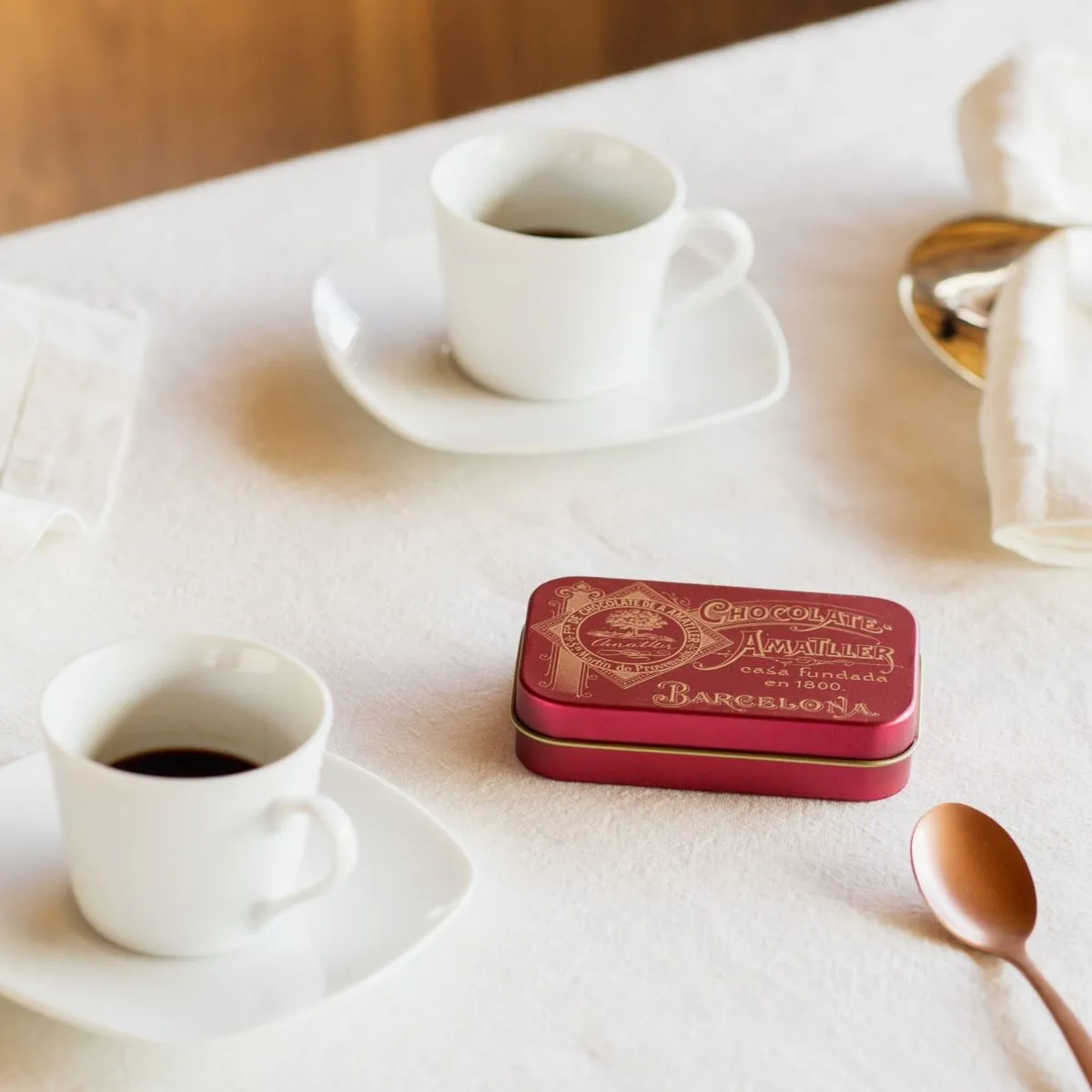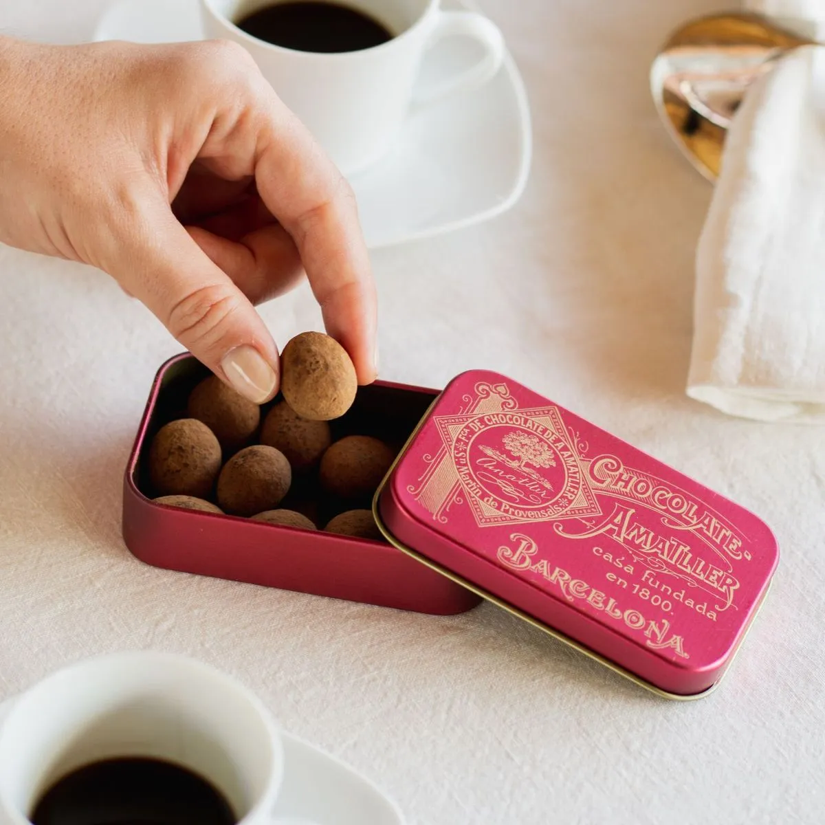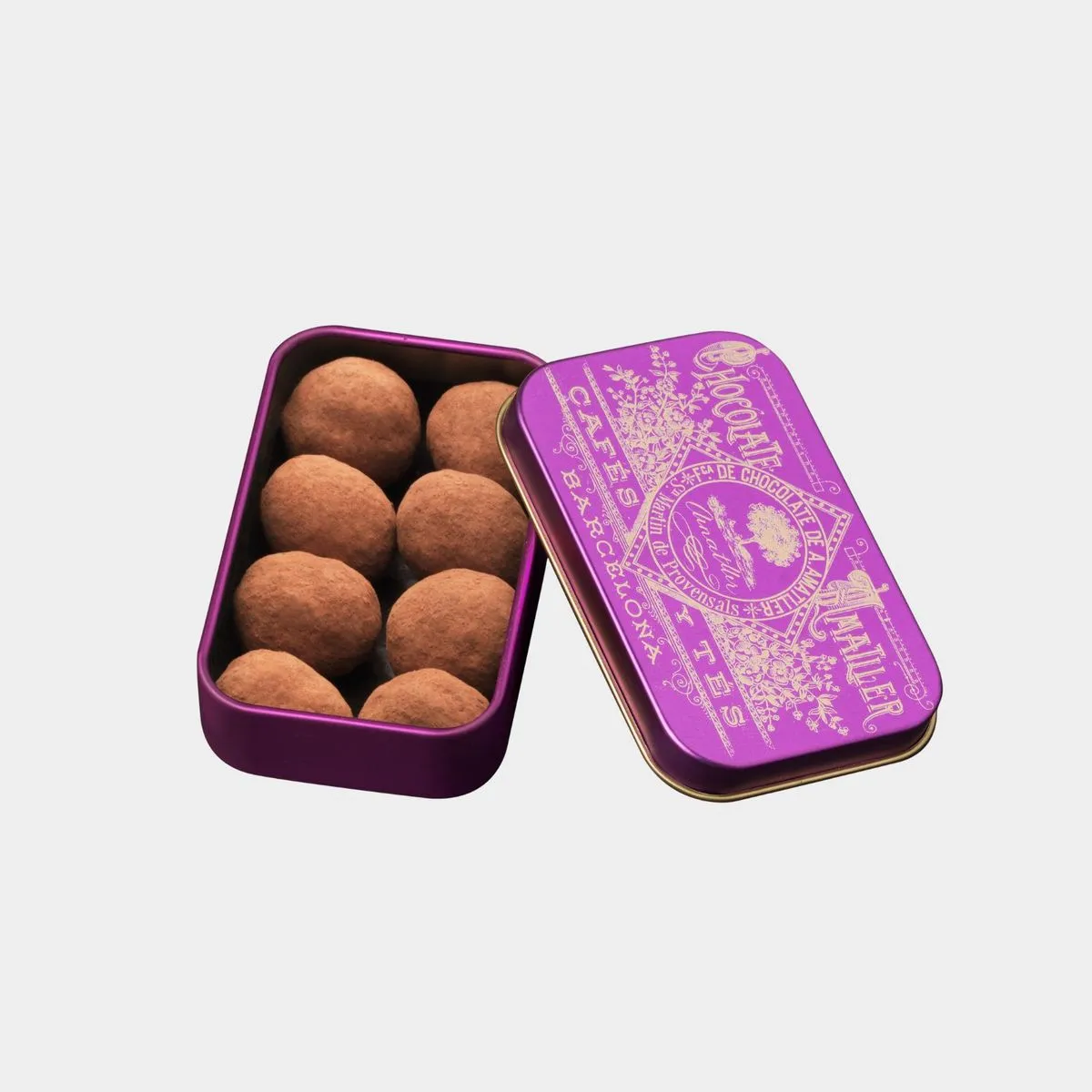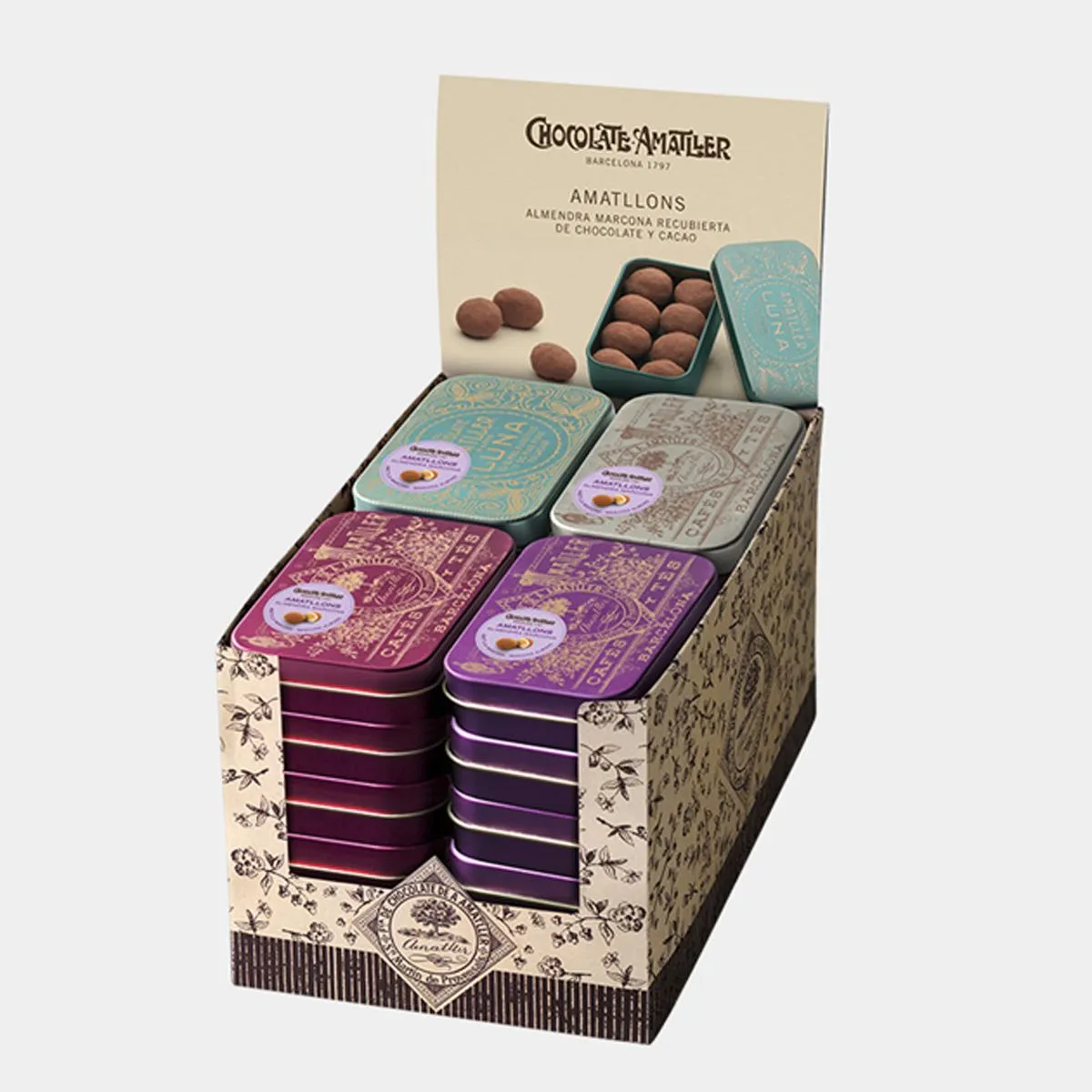 Se presentan en cajitas de 35g metálicas de diseños variados, diseñadas a partir de logotipos presentes en antiguos objetos publicitarios de la marca Amatller.