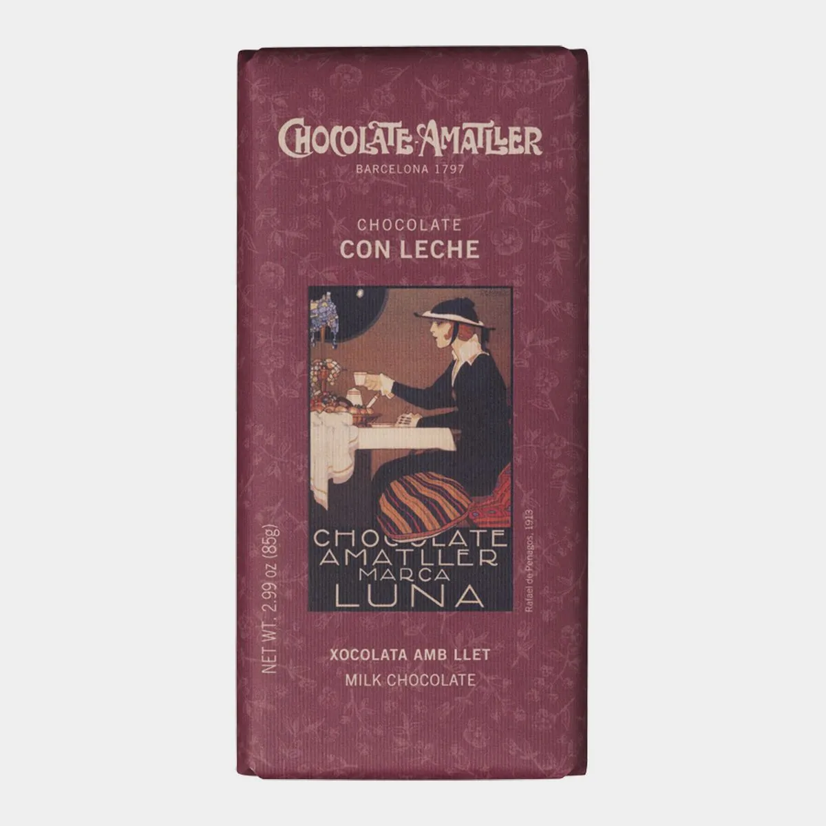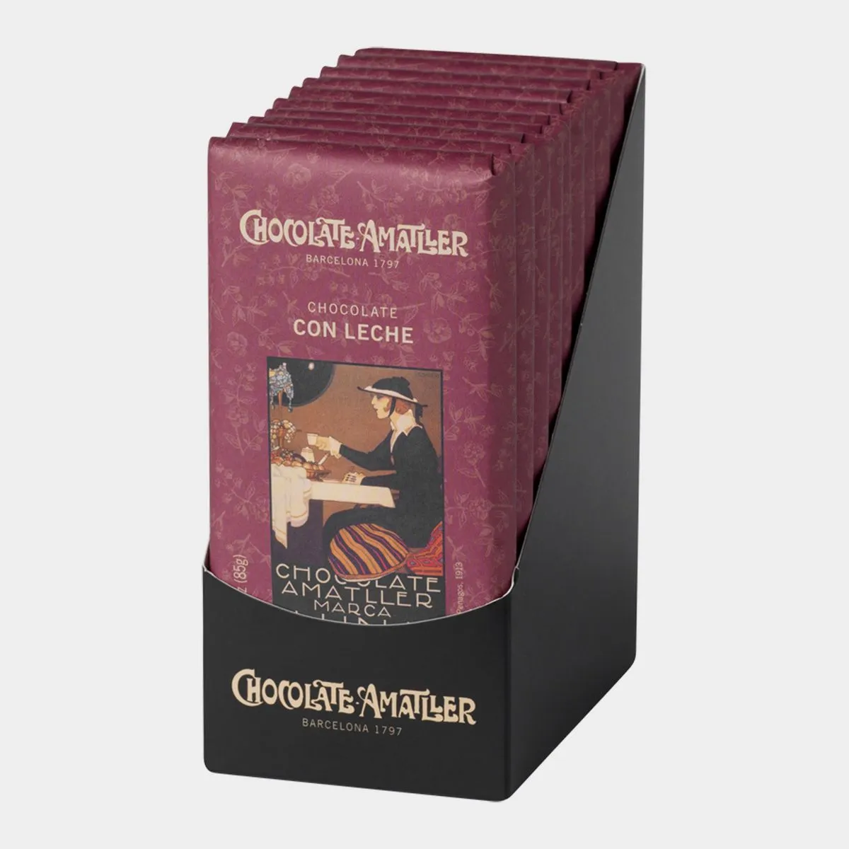 Chocolate con leche elaborado con un 32% de cacao, siguiendo el método propio Amatller de selección, tostado, refinado y conchado.